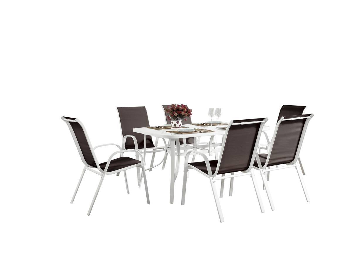 Sa table de 150 x 90 x 72 cm, robuste et pratique, offre une surface idéale pour vos repas en famille ou entre amis. Les six fauteuils en textilène, légers, résistants et faciles à entretenir, garantissent une assise agréable et durable, même exposés aux intempéries.